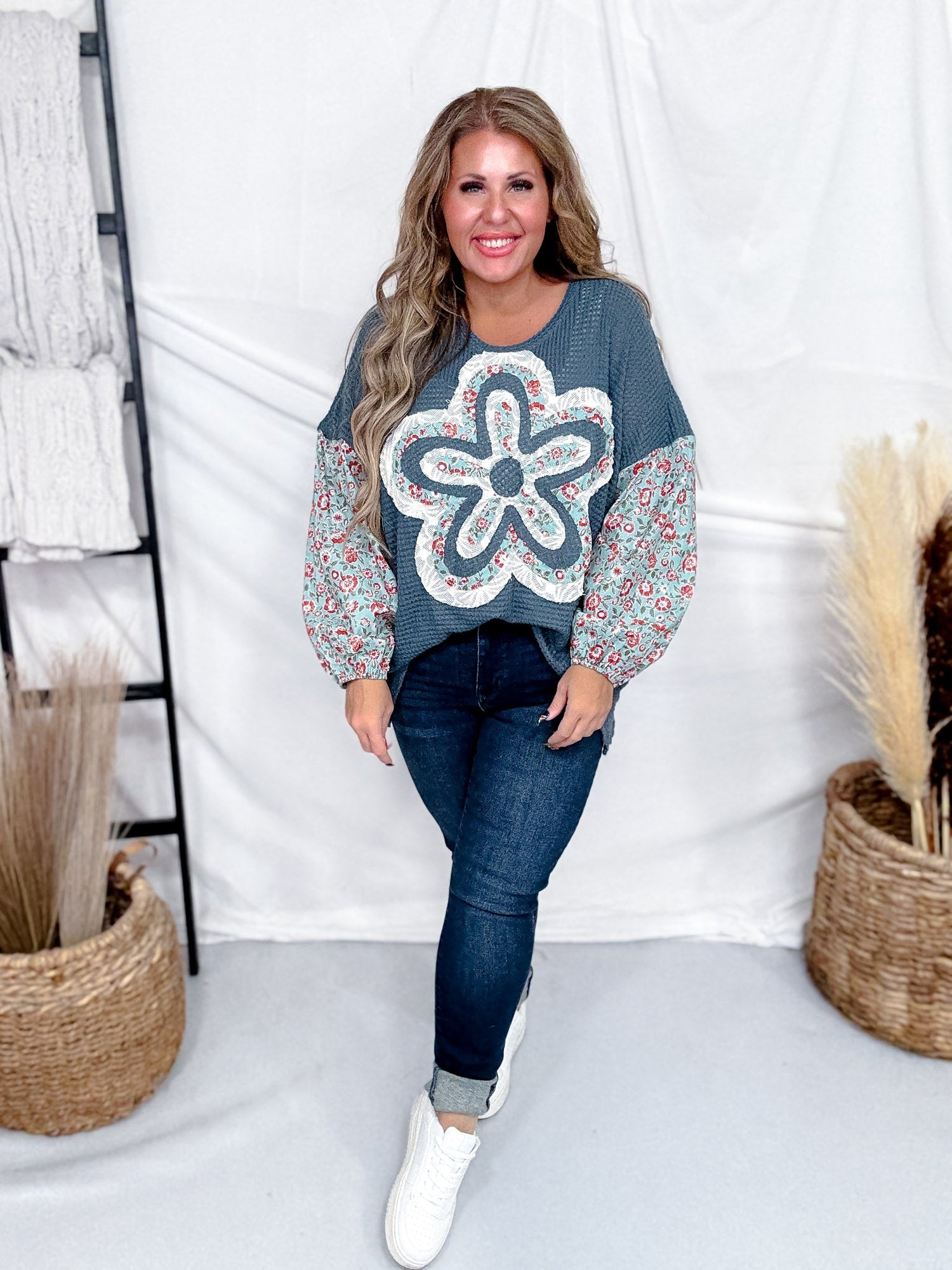 Brighten your day with this waffle knit long sleeve top featuring a charming flower applique on the front and playful floral sleeves. The blue and seafoam hues blend perfectly to create a fun, fresh look that’s as cozy as it is stylish.