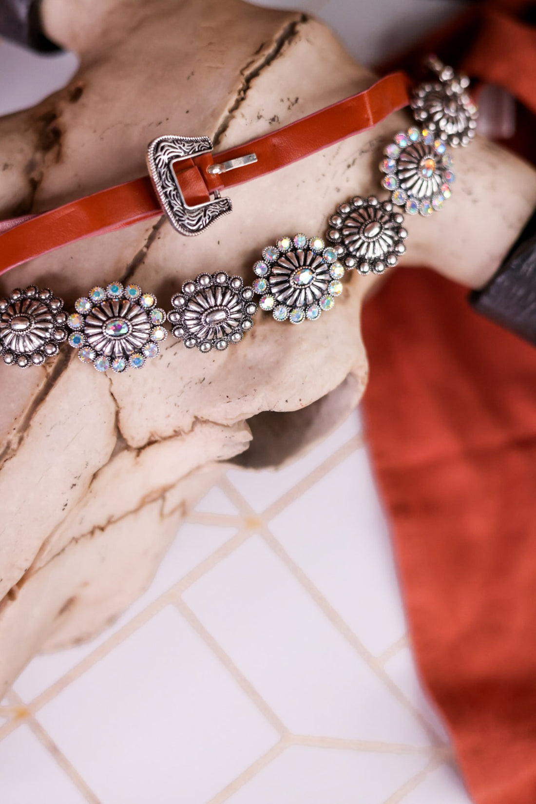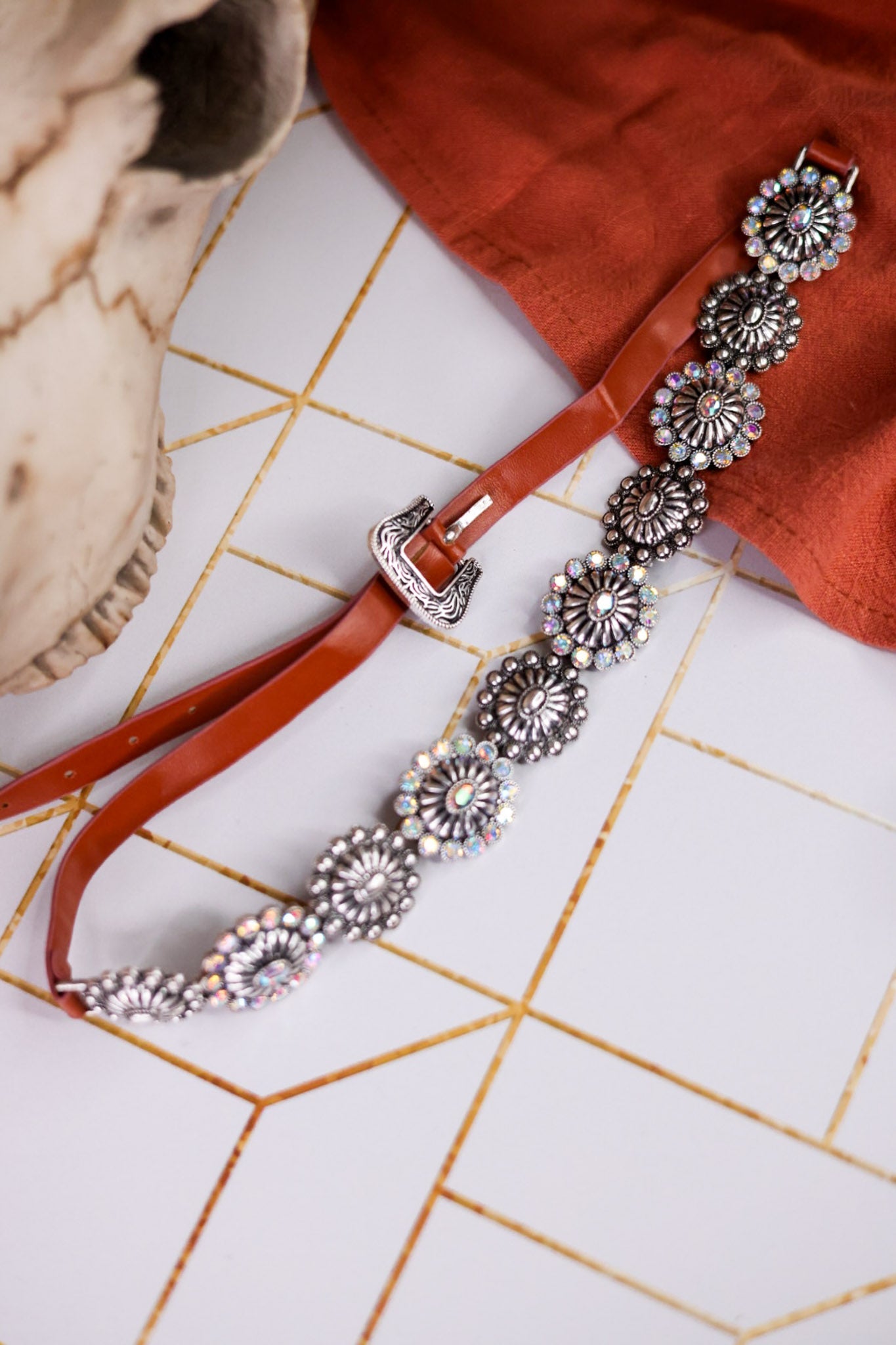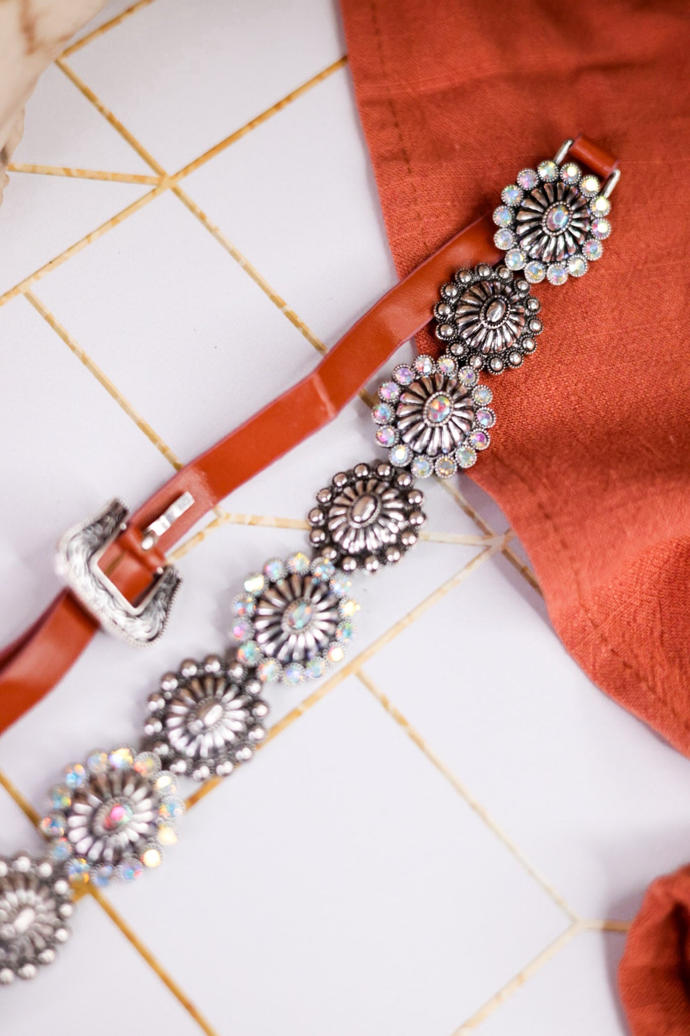 Add a splash of southwestern charm with this adjustable hat band! Crafted from terra cotta-colored faux leather, it features shining silver conchos adorned with iridescent stones that catch the light just right. Perfect for channeling those fun western vibes, it fits comfortably on most hats, making your look effortlessly bold and playful.