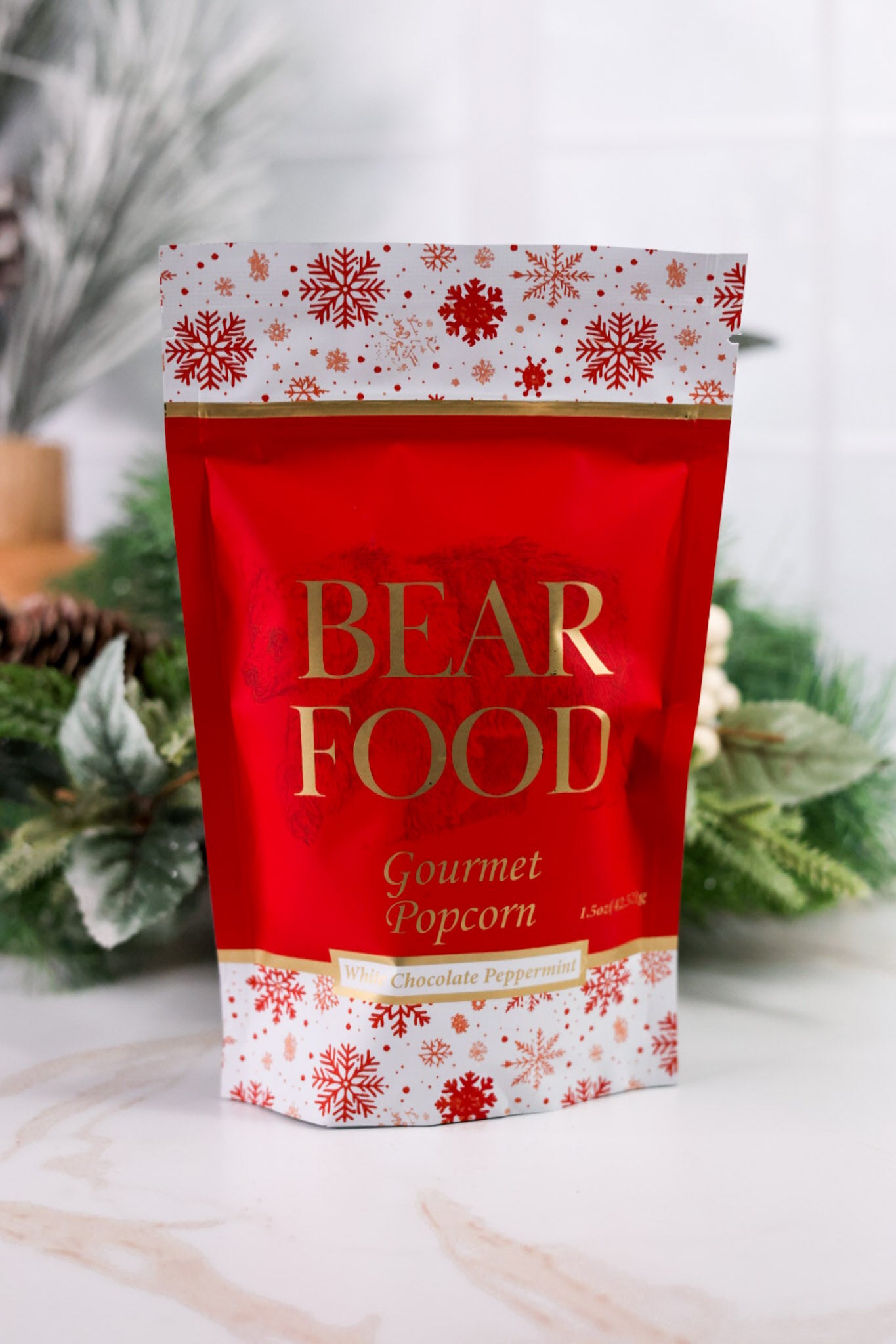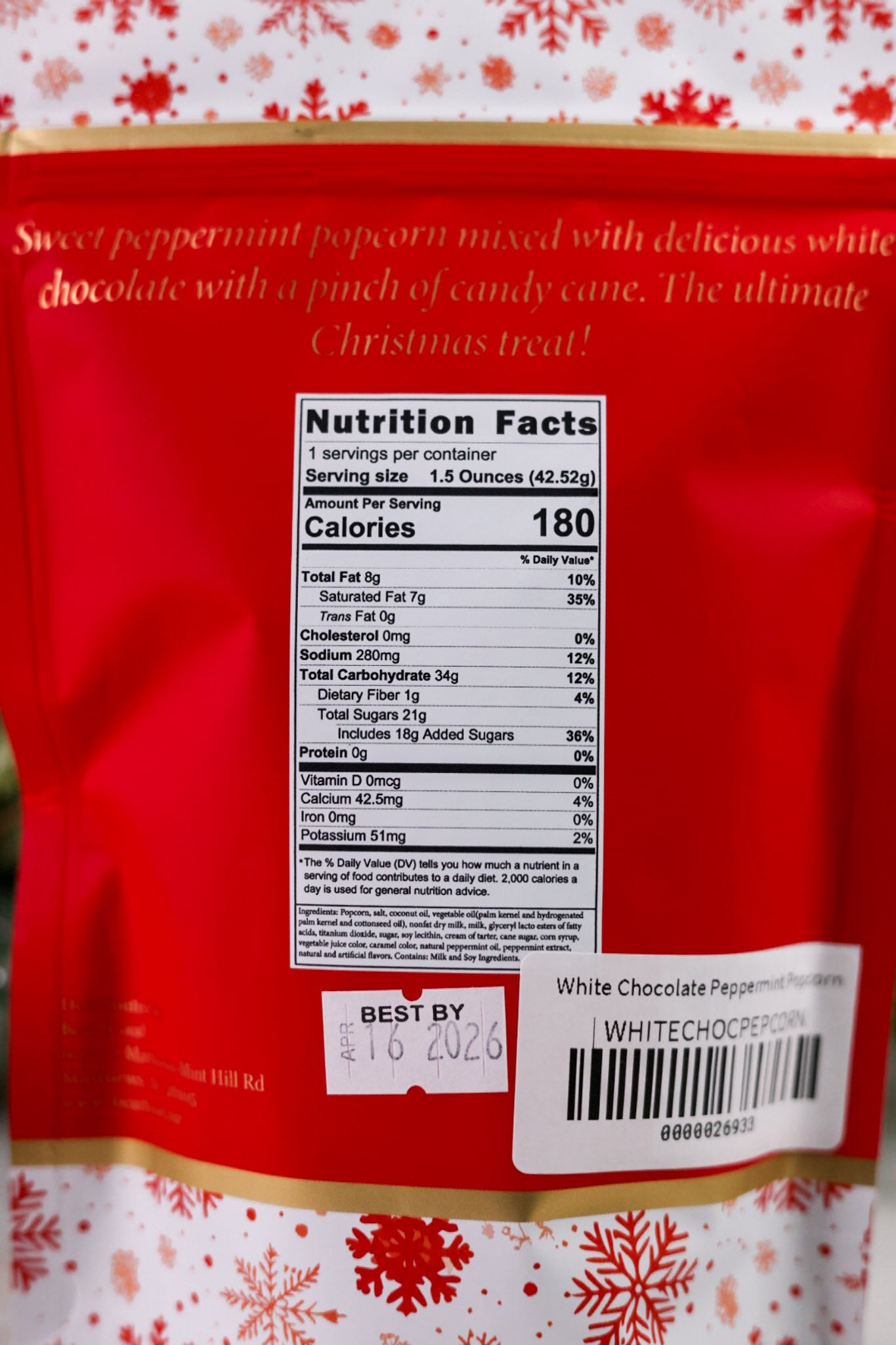 This holiday specialty popcorn is out of this world! A candied popcorn with peppermint extract, rolled in white chocolate and small bit of crushed candy canes. The peppermint flavor isn't overbearing and the flavors make the perfect holiday treat! This will be the best winter popcorn you'll try!