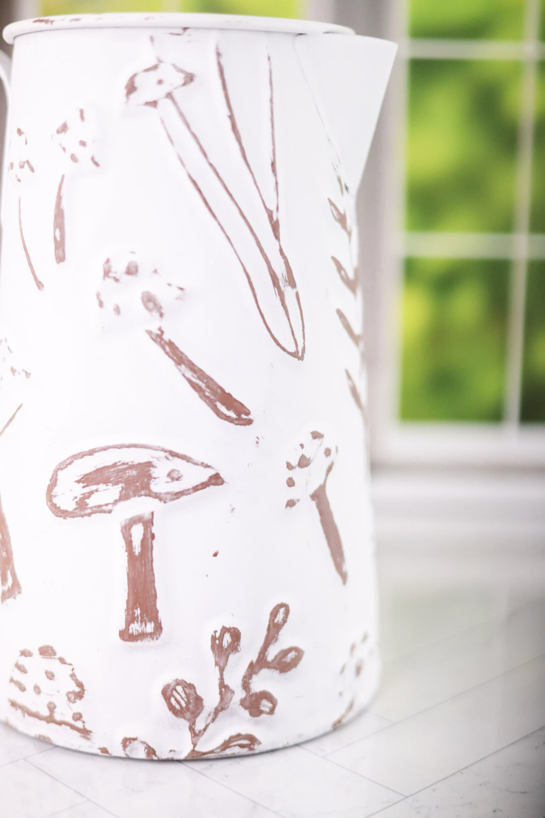 This elegant White Embossed Metal Pitcher with Mushroom Design will add a touch of charm to any home. The decorative pitcher features intricate embossed mushroom designs, giving it a unique and whimsical look.