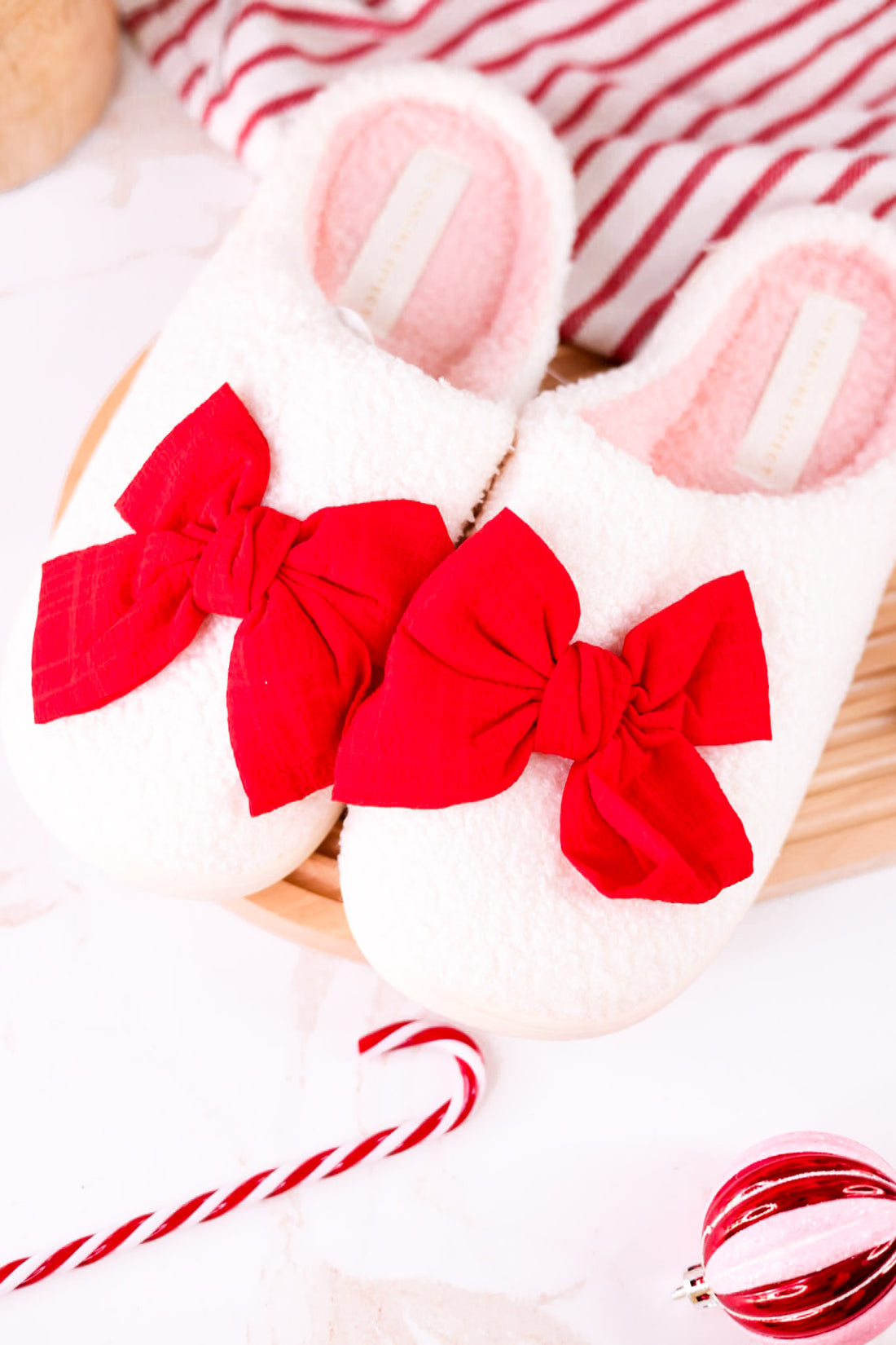 Step into cozy charm with these white fuzzy slippers crowned by a playful red bow. The soft, plush exterior keeps your feet snug, while the sturdy hard soles provide reliable support and traction indoors. Perfect for lounging in style or adding a splash of fun to your relaxation routine.