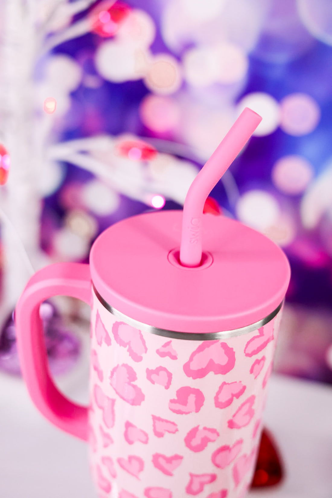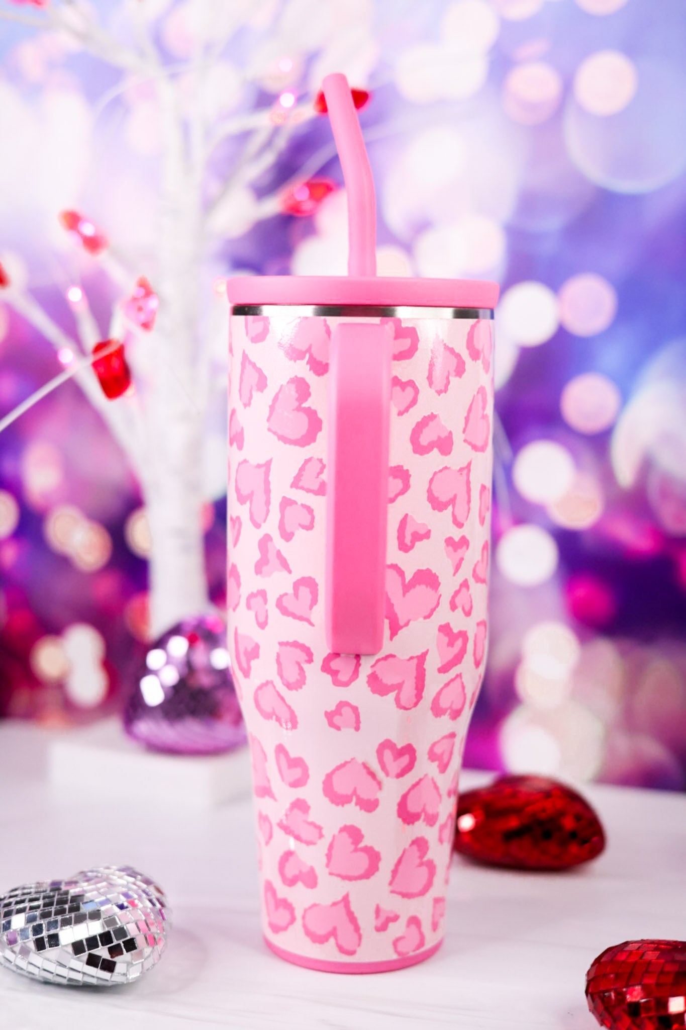 Quench your thirst with the Wild At Heart 40oz Mega Mug—your new hydration obsession! Dressed in eye-catching pink with charming heart-shaped leopard print, this Valentine-ready vessel means business. The insulated design keeps drinks at the perfect temperature, while the cup holder-friendly frame and ergonomic grip handle make it your ideal sidekick. Complete with a flexible silicone-tipped straw, staying hydrated has never felt this fun or fabulous.