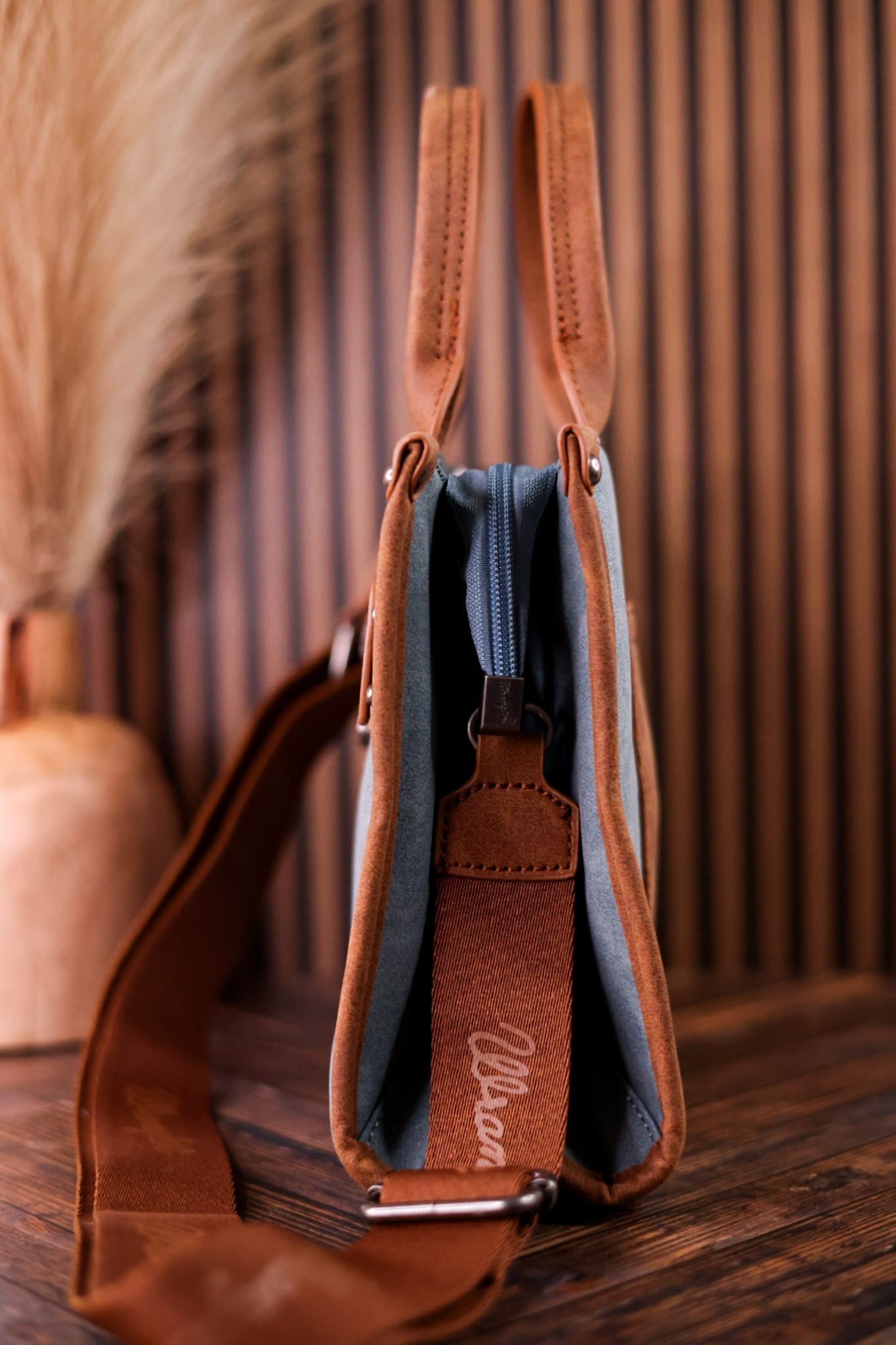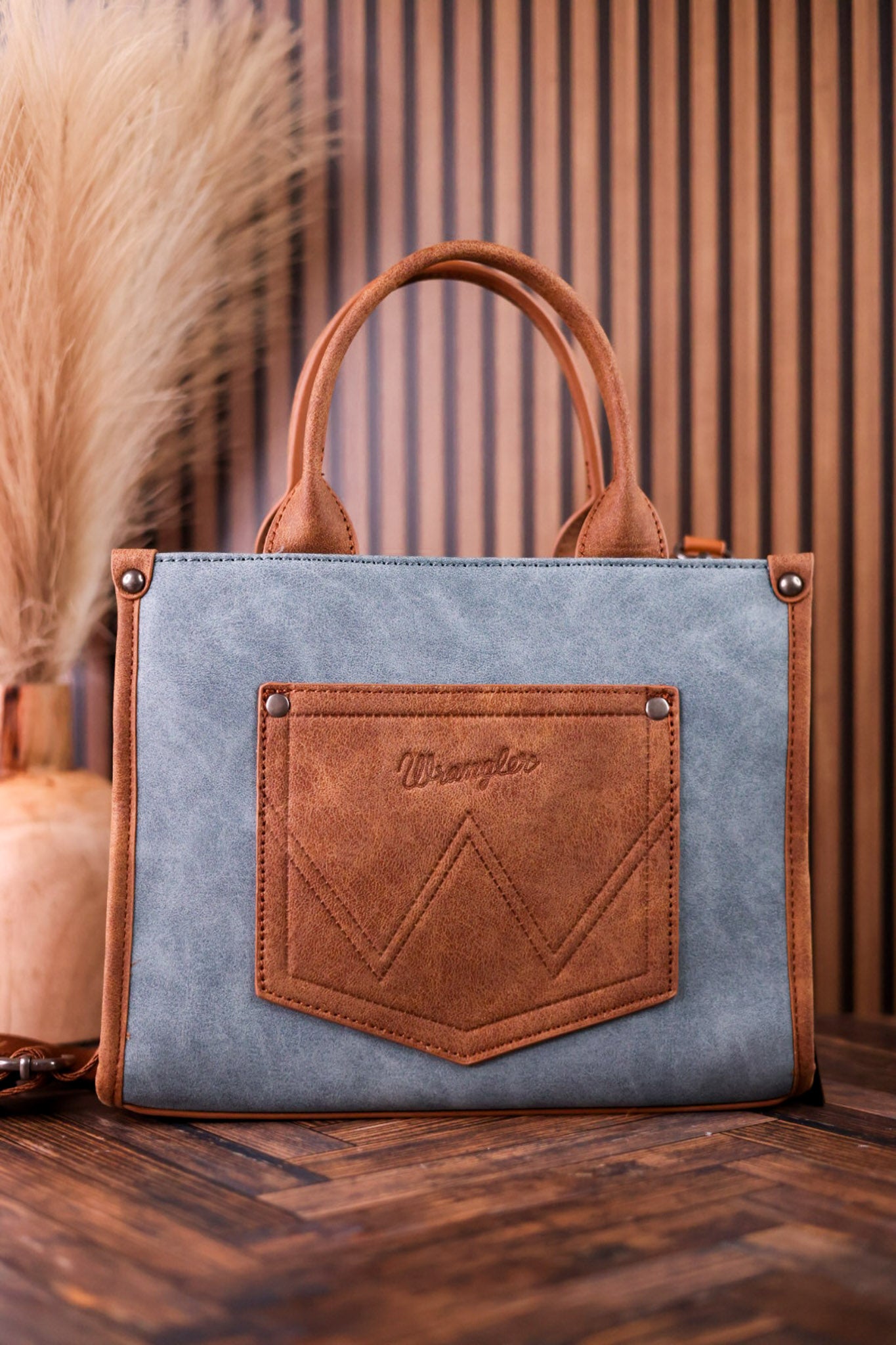 Carry with confidence using the Wrangler Bag in slate blue. Crafted from durable vegan leather, this stylish tote features a studded Wrangler belt buckle design for a bold, distinctive look. Inside, multiple pockets provide organized storage.