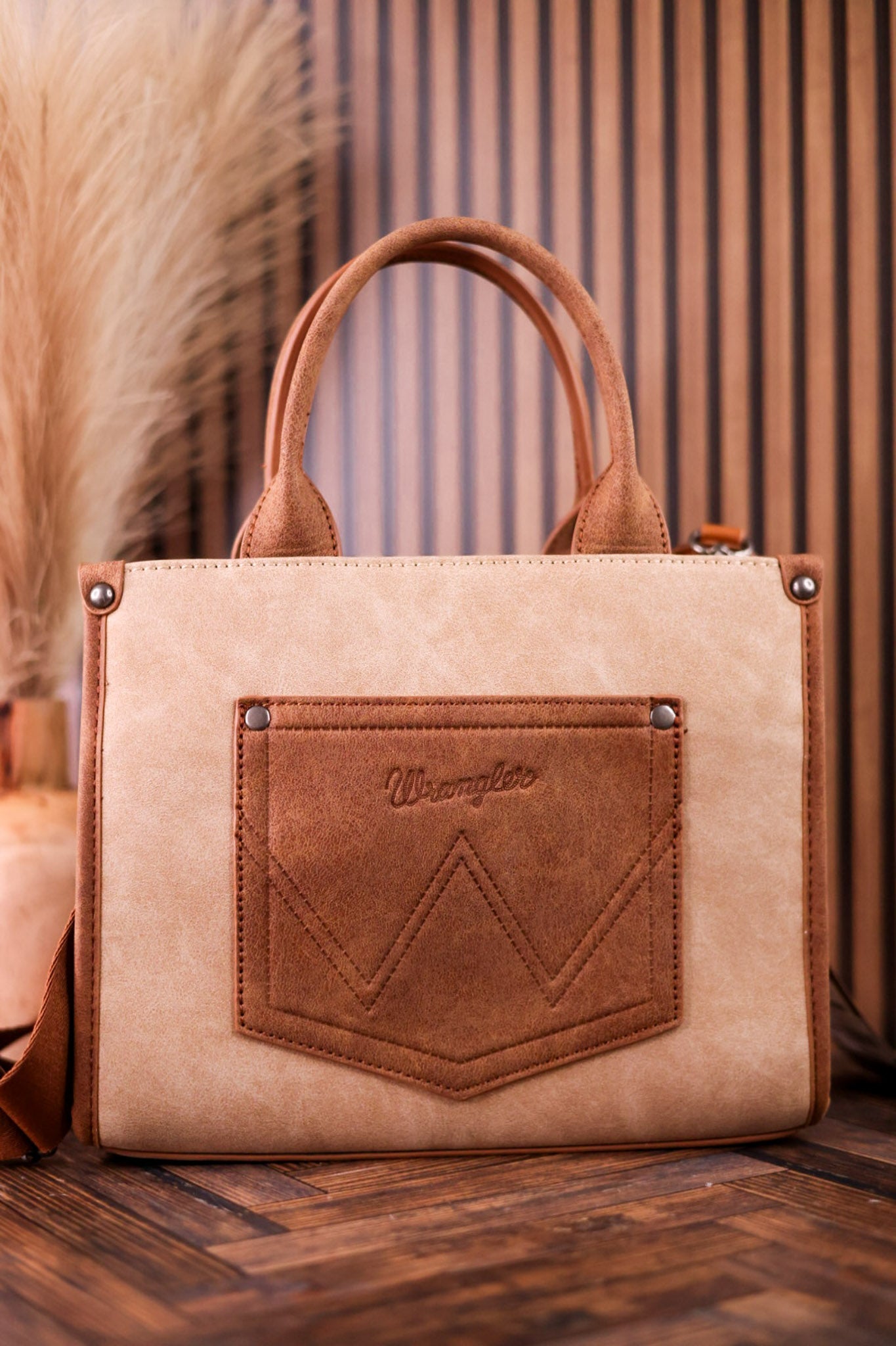 This light tan vegan leather tote bag combines style and safety with its studded Wrangler belt buckle design. Thoughtfully designed for everyday use, it features multiple inner pockets offering secure and organized storage.