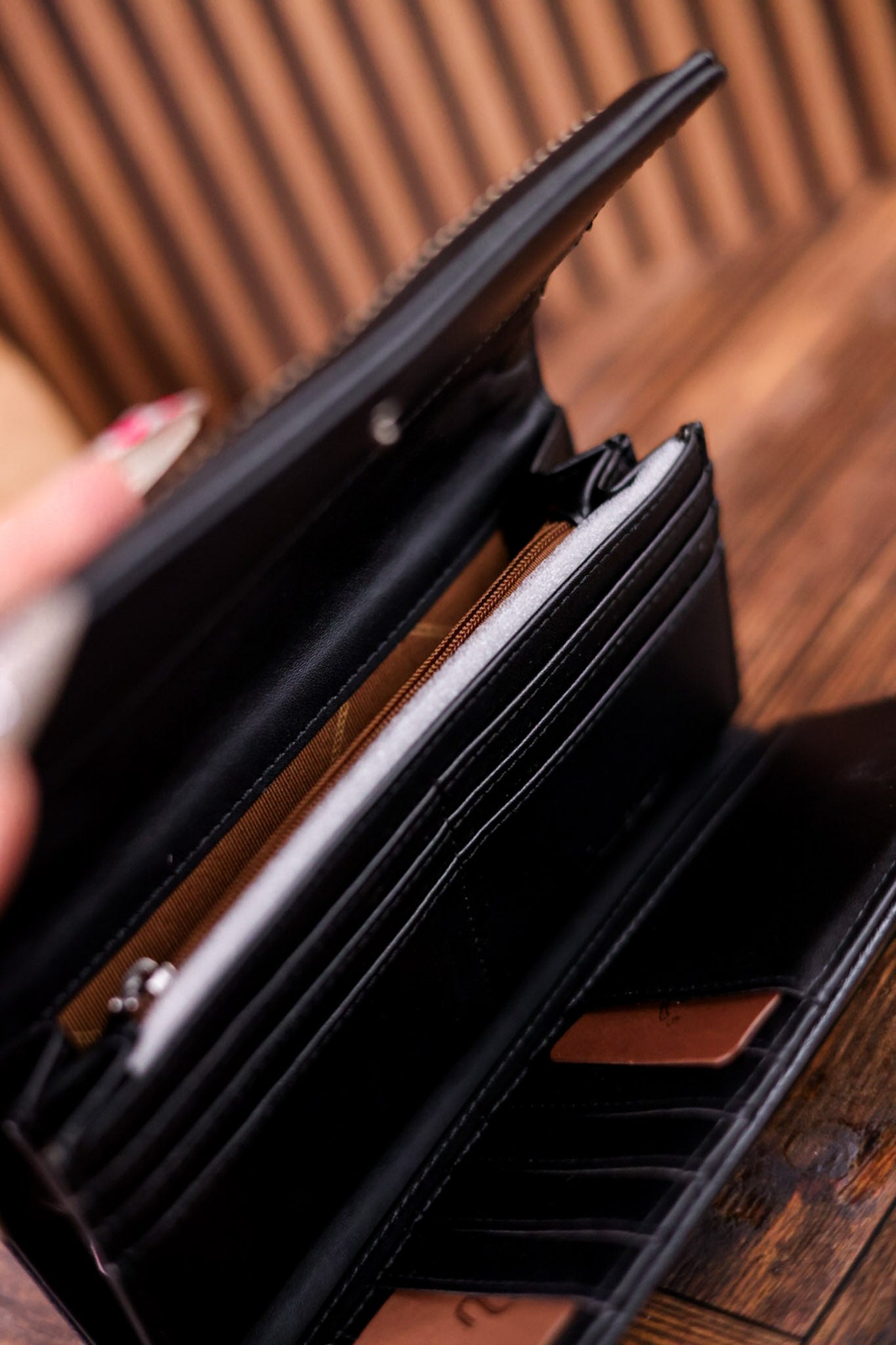 Meet the Black Wrangler Denim Tri Fold Convertible Wallet — your new favorite sidekick! Crafted from rugged Wrangler denim and smooth faux leather, this wallet folds up neatly yet expands to hold all your essentials. Plus, with an easy-attach strap, it transforms into a wristlet for hands-free fun. Stylish, sturdy, and ready for wherever your day takes you!