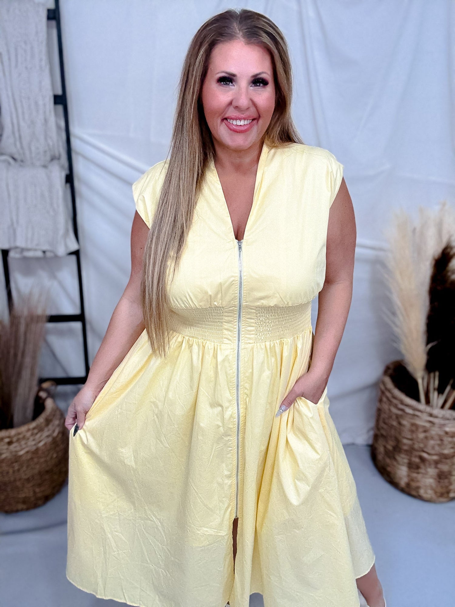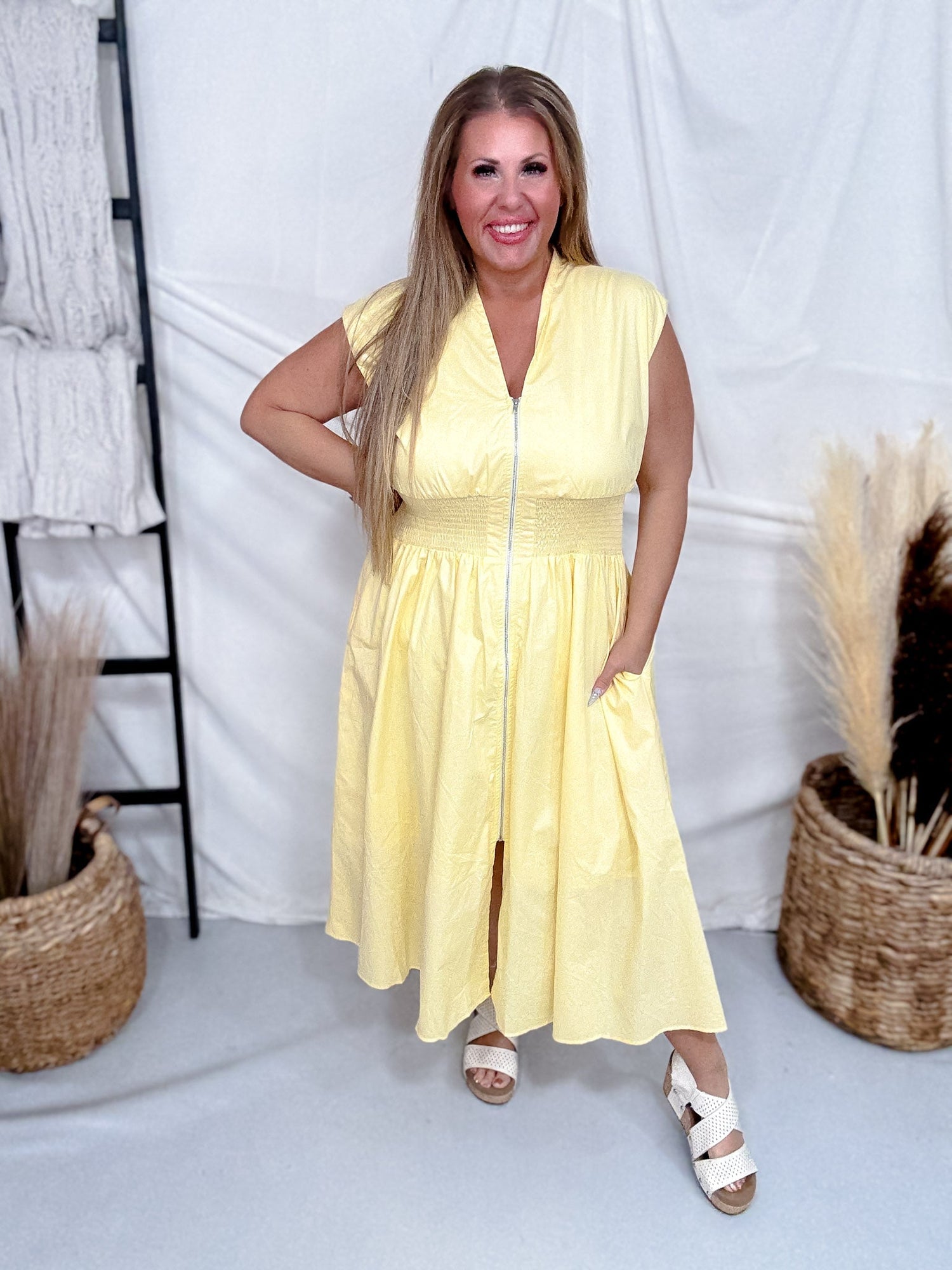 This cheerful yellow midi dress combines style with comfort in one easy-to-wear package. The smocked waist creates a flattering fit while the zip front makes getting dressed a breeze. Casual enough for everyday wear, polished enough for weekend plans—your new favorite dress awaits.